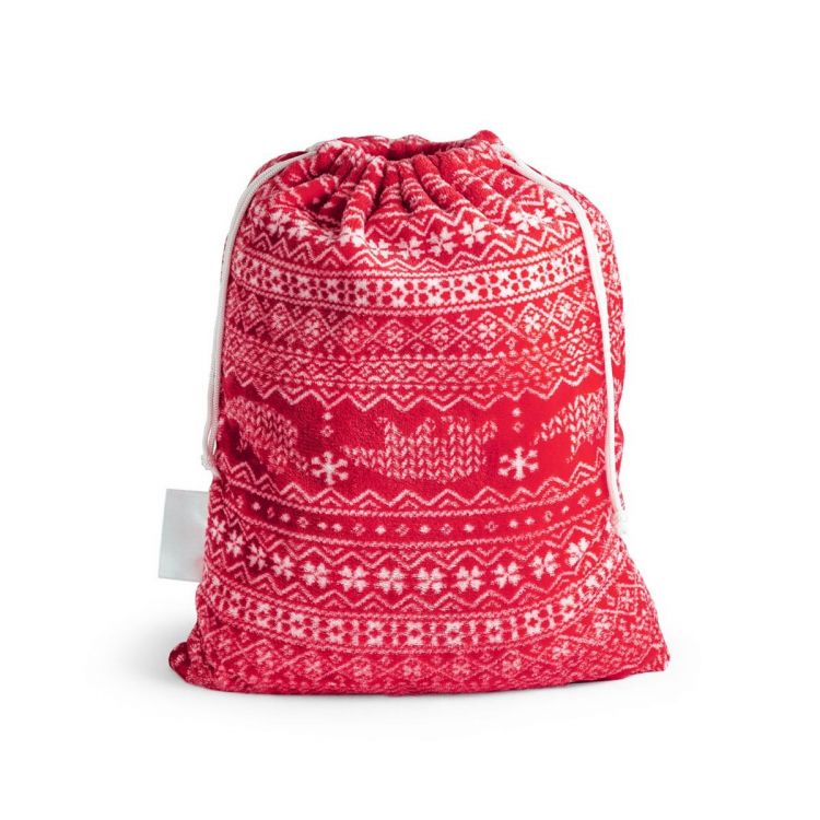 Polar blanket (240 g/m²) with velvety finish and anti-pilling treatment. The blanket includes a bag in the same material, with Christmas decorations, which closes at the top with a drawstring. Includes a customisable label. Product in red color