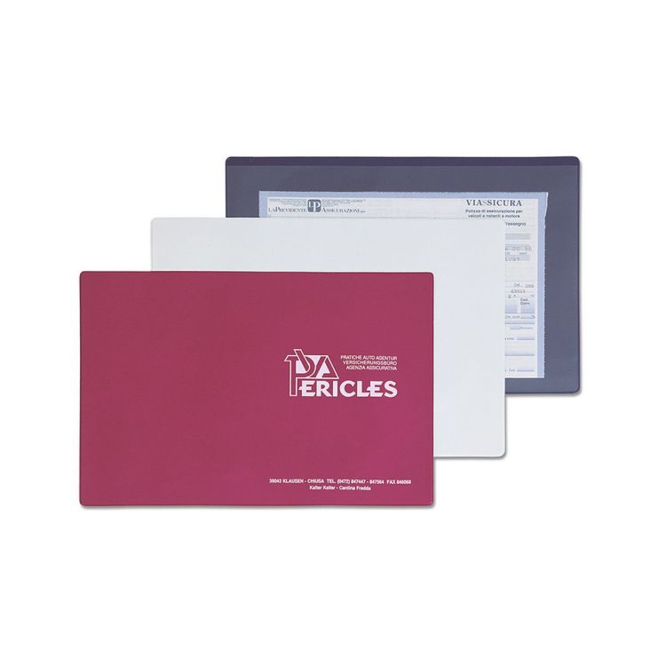 Policy envelope with one side in leatherette and the other in transparent PVC, opening on the long side for inserting documents.