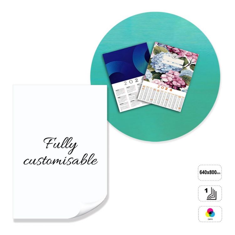 Vertical poster calendar, fully customisable. The product is made of 350 gram matt coated paper, printable on the front in full colour. Available lamination on the front with a choice of gloss, matt or soft touch. The calendar can be customised by modifying the preset template, or completely constructed following the guidelines provided in a neutral template.
