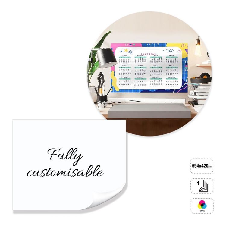 Horizontal poster calendar, fully customisable. The product is made of 350 gram matt coated paper, printable on the front in full colour. Available lamination on the front with a choice of gloss, matt or soft touch. The calendar can be customised by modifying the preset template, or completely constructed following the guidelines provided in a neutral template.