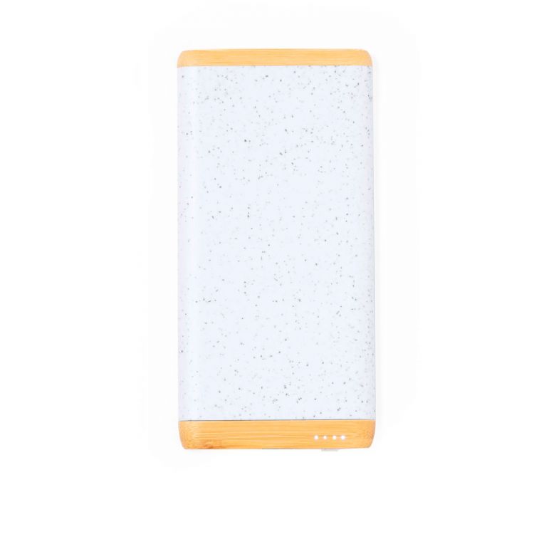 External auxiliary battery made in a combination of bamboo and wheat straw. With 5,000 mAh charging capacity and Type C input/output + USB output connections. With push button and LED charge status indicator, presented in an individual box of eco design in kraft cardboard.Materials such as bamboo encourage the use of natural raw materials, reducing pollutant emissions. It comes from a highly resistant and versatile plant with rapid growth and regeneration, making of it an excellent alternative to traditional wood.Wheat straw promotes the use of natural raw materials, thus reducing pollutant emissions.The capacities shown in all our external auxiliary batteries are real, all of them incorporating non-recycled, grade A batteries, with a service life of at least 500 charging cycles, and complying with CE regulations. In addition, they are manufactured according RoHS standards, and in compliance with the following safety requirements: Power bank overcharge protection system. Complete discharge protection system, which increases the durability of the power bank. Blocking system to prevent short circuits. Constant charging transfer system, in accordance with the capacity of the target device. (white color)