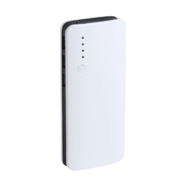 Plastic USB power bank with 3 charger ports and 10000 mAh battery. Without charger cable.