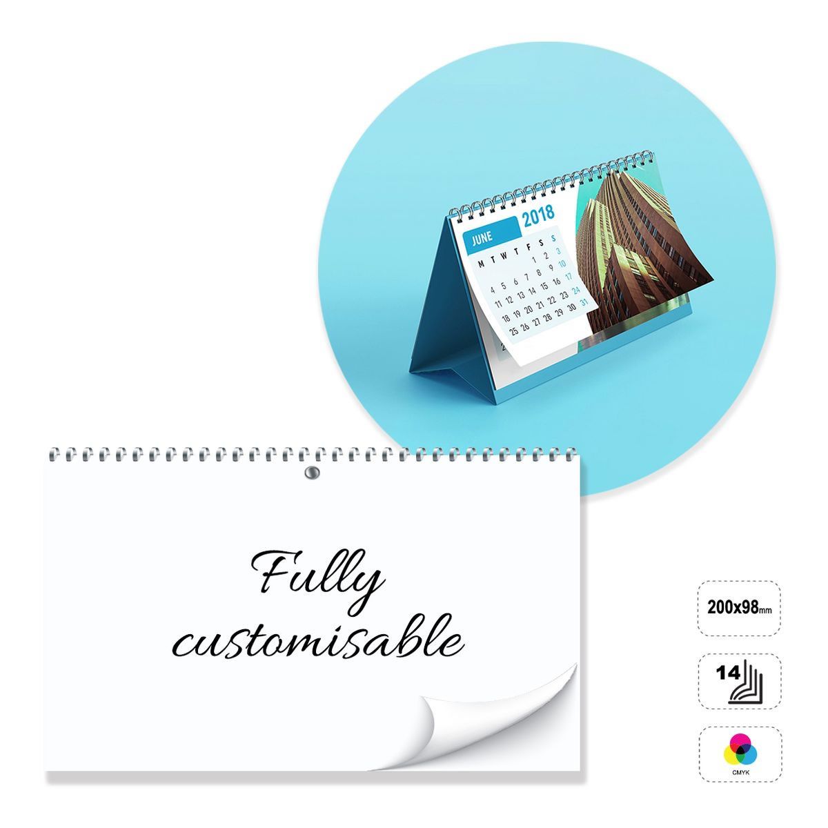 Horizontal desk calendar, fully customisable. The product consists of 14 sheets of 135 gram matt coated paper, printable front or front and back in full colour. Bound with a silver, white or black metal spiral at the top. Non-printable 300 g white cardboard backing. The calendar can be customised by modifying the preset template, or completely constructed following the guidelines provided in a neutral template.