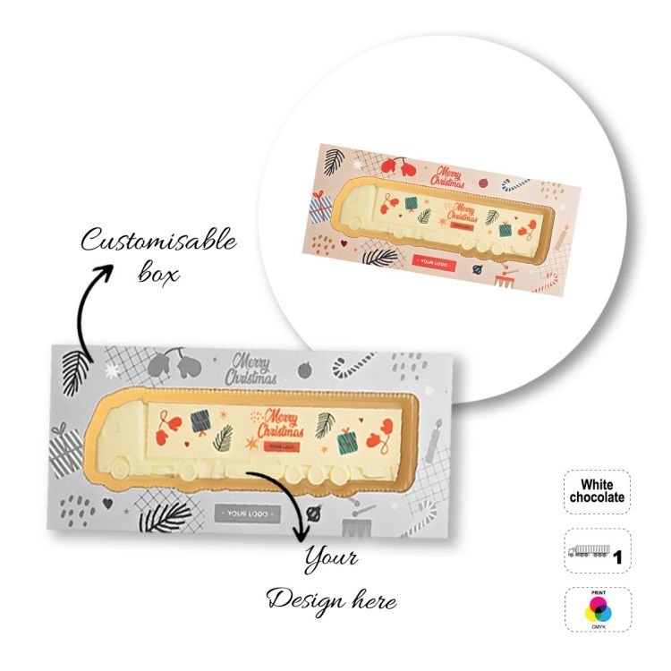 White chocolate bar printable on the surface. The letters in the product code correspond to the type of bar: A- circle (65 g), B- truck (65 g), C- tube (65 g), D- comment cloud (65 g), E- rectangle (65 g). Packaging: fully customizable paper box (paper finish: white or kraft, to be chosen when ordering), preformed tray made with rPET. Possibility of customization with full color printing on the surface of the bar, using food coloring. Minimum shelf life - 8 months.