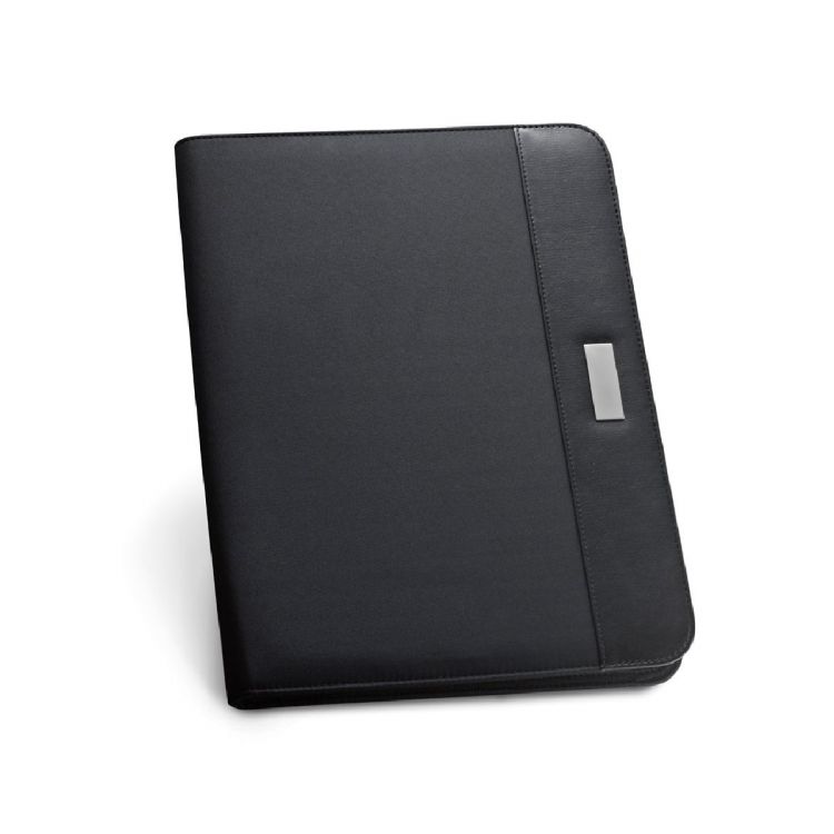 PU and microfibre A4 folder, with zip fastening. The folder contains several interior pockets, 40 lined pages pad (60 g/m²) and a pen holder (pen not included). Plate available for customization. Product in black color