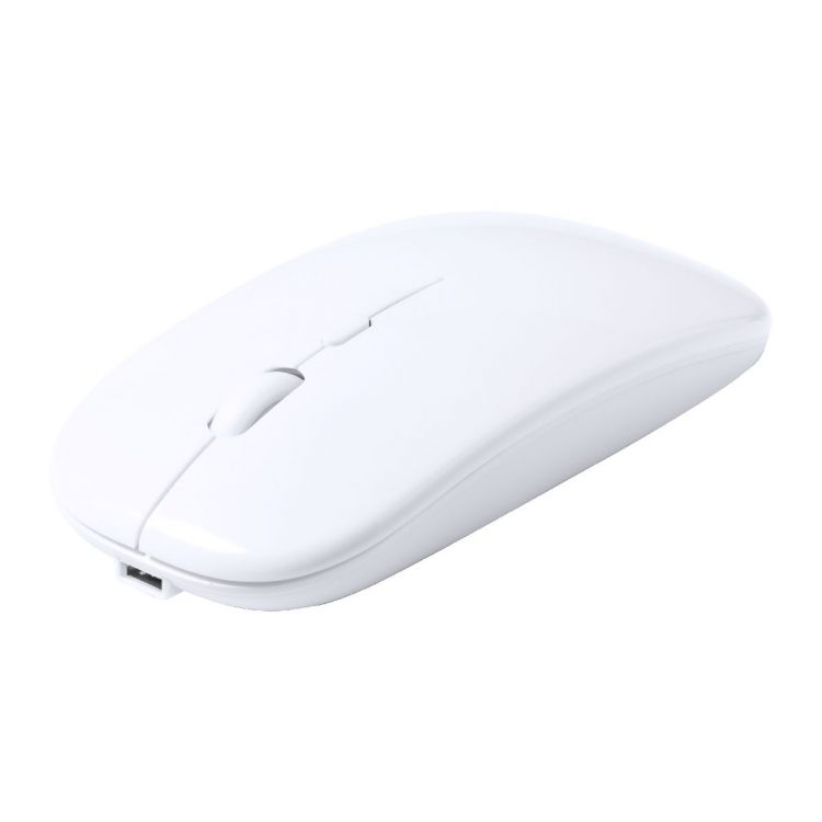 Wireless optical mouse with recycled ABS plastic housing and built-in rechargeable battery. Including USB charger cable, in white color