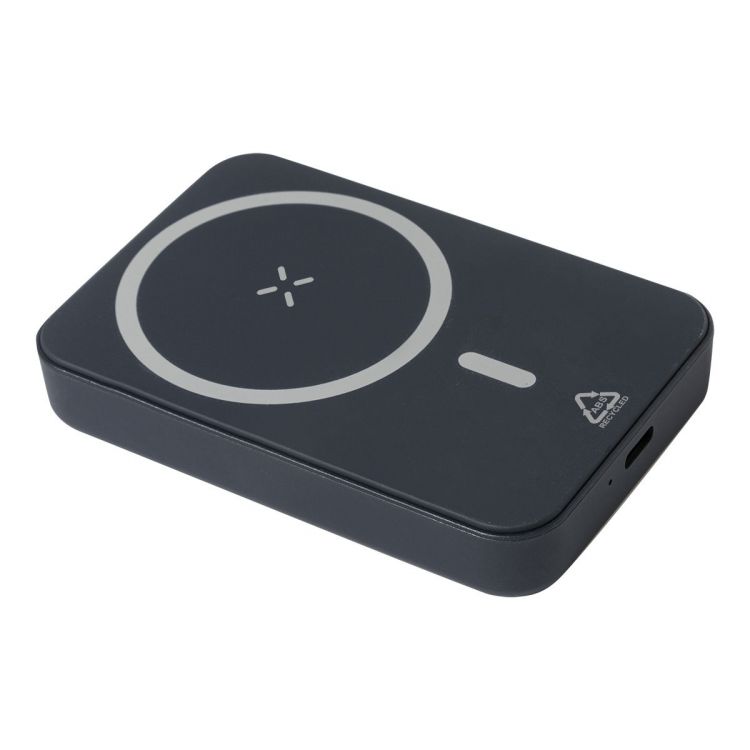 Recycled ABS power bank with 5000 mAh battery and built-in magnetic wireless charger (5W). With USB-C input and charger port. Including self-adhesive metal ring to use the magnetic function on any wirelessly chargeable device. Compatible with iPhone® 12 or newer. Including USB charger cable.