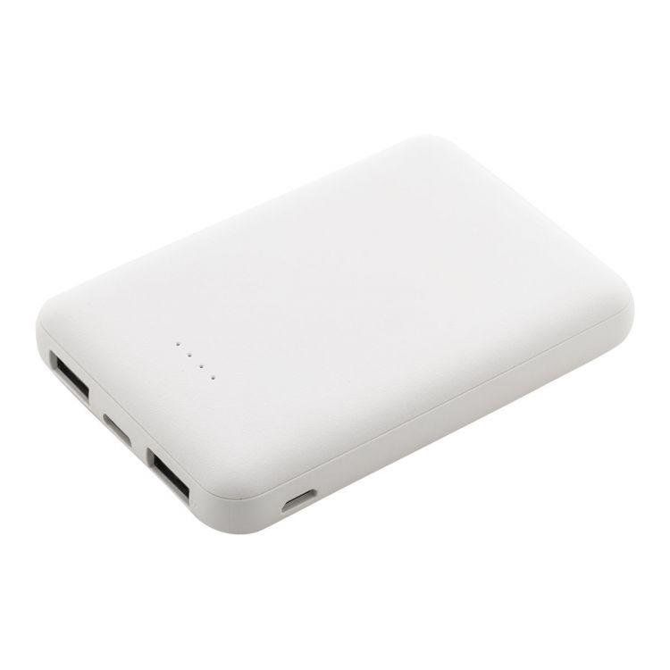 Recycled ABS power bank with 5000 mAh battery. With 2 USB and 1 USB-C charger ports. Micro USB and USB-C input ports. Including USB charger cable.