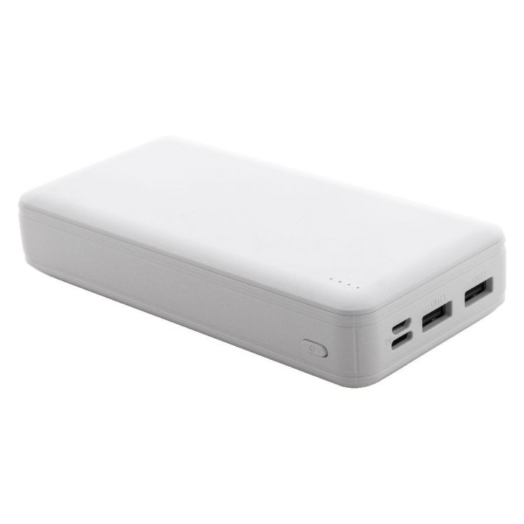 Recycled ABS power bank with 20000 mAh battery. With 2 USB and 1 USB-C charger ports. Micro USB and USB-C input ports. Including USB charger cable.