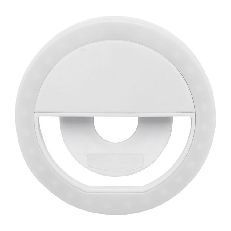 Recycled ABS selfie ring light with 28 LED for mobile phones. With 3 adjustable brightness levels and built-in rechargeable battery (150 mAh). Including USB charger cable, in white color