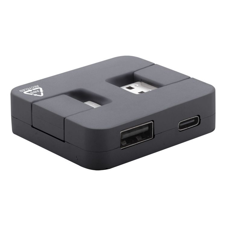 Recycled ABS plastic USB hub with 2 USB and 2 USB-C ports. With foldable USB and USB-C connectors. USB 2.0.