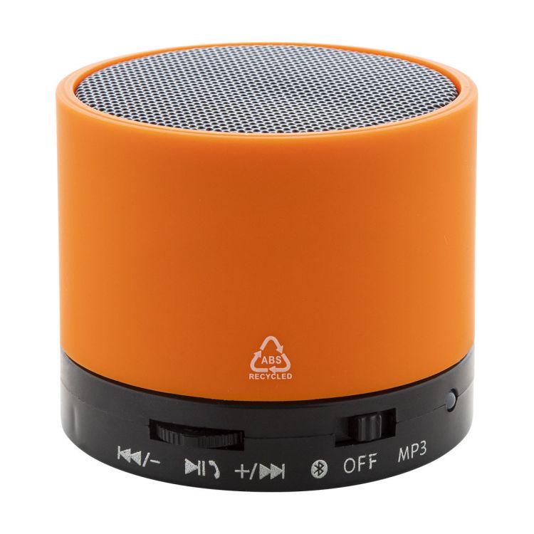 Recycled ABS wireless speaker in rubberized housing with metal mesh and rechargeable battery (300 mAh). With hands-free call and micro SD MP3 playback functions. Including USB charger cable.