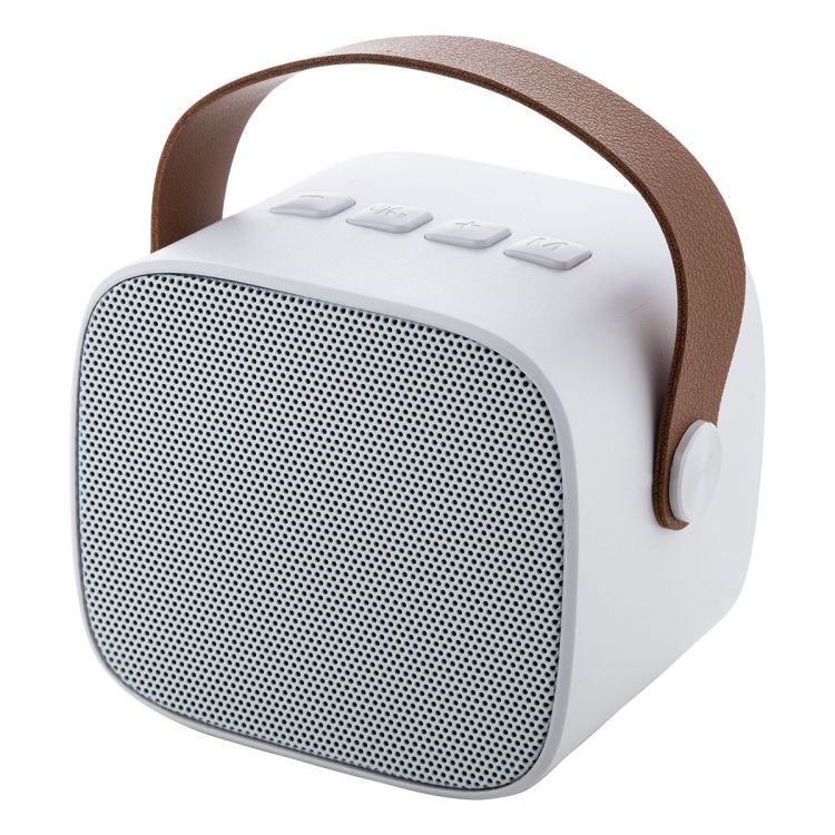 Recycled ABS wireless speaker with PU leather carry strap and built-in rechargeable battery (1200 mAh). Including USB charger cable, in white color