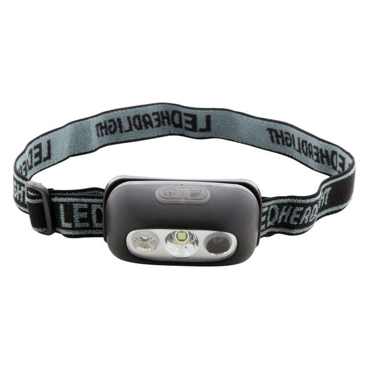 Plastic headlamp with built-in USB rechargeable battery (400 mAh) and adjustable strap. With high power COB light and dual motion sensors. With high, low and motion sensitive light modes. Including USB charger cable