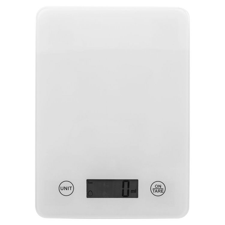 Digital kitchen scale with tempered glass weighing platform and built-in USB rechargeable battery (200 mAh). Capacity: 5 kg, graduation 1 g, measurement units: g/oz. With water/milk ml indicator. Including USB charger cable
