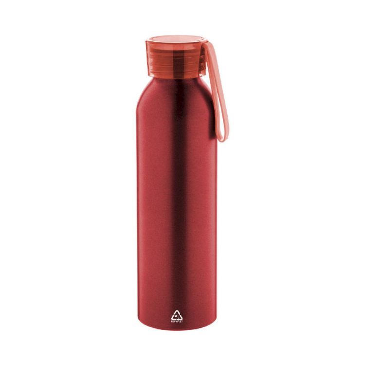 Recycled aluminium bottle with matching colour lid and silicone carry strap, 600 ml.