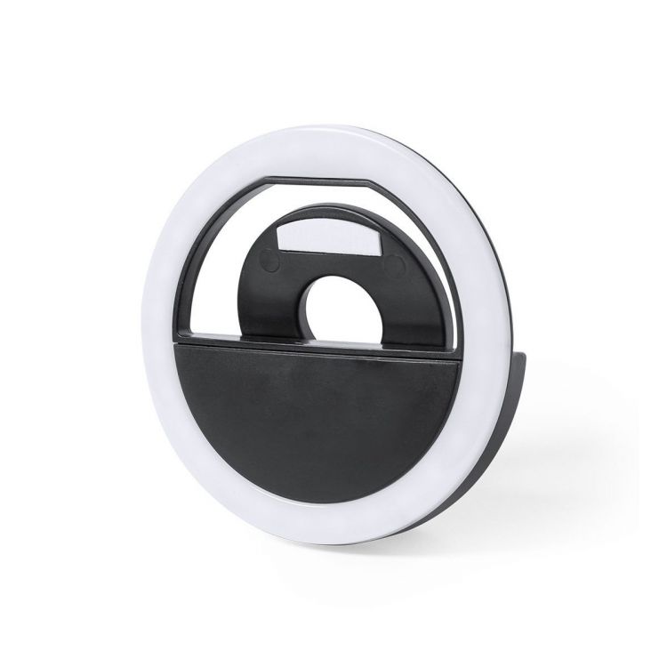 LED ring light with smartphone holder, made of resistant ABS. 28 LEDs, with 3 intensity levels and rechargeable via USB (Micro USB cable included). Presented in an attractive design box, with instruction manual available in English and Spanish. (black color)