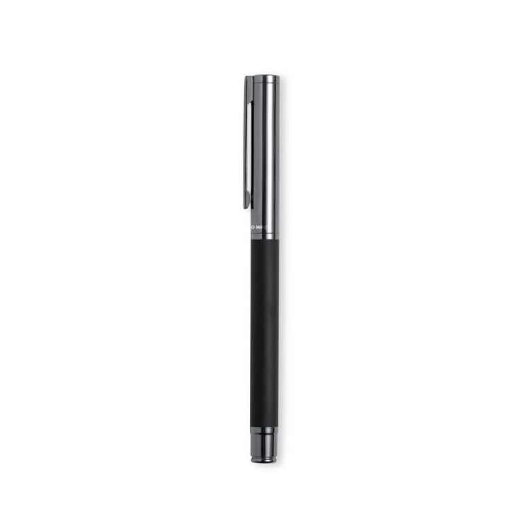 Antonio Miró roller pen made of metal, with matte black barrel. Chrome plated fittings and cap with the brand's logo. Jumbo cartridge and blue ink. Presented in an elegant and resistant black individual box with Antonio Miró logo and matching sleeve. (black color)