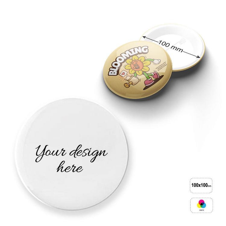 Tin badge, fully customisable. The STANDARD product includes the plastic-coated paper insert with full-colour digital printing and the classic Tin badge fastener. Several optional finishes are available, including: glow-in-the-dark, reflective, UV varnish, silver, gold, canva-effect paper, armadillo skin effect, lizard skin effect, glitter, embossing. Different options for the back of the badge are also available, your choice of: crocodile clip, magnet, magnetic clasp.
