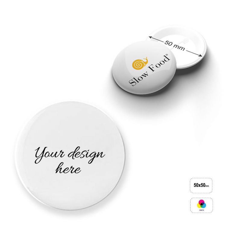 Tin badge, fully customisable. The STANDARD product includes the plastic-coated paper insert with full-colour digital printing and the classic Tin badge fastener. Several optional finishes are available, including: glow-in-the-dark, reflective, UV varnish, silver, gold, canva-effect paper, armadillo skin effect, lizard skin effect, glitter, embossing. Different options for the back of the badge are also available, with a choice of: bottle opener with magnet, bottle opener with key ring, pinless clasp, press stud, plastic clip, crocodile clip, magnet, magnetic foil, magnetic clasp.