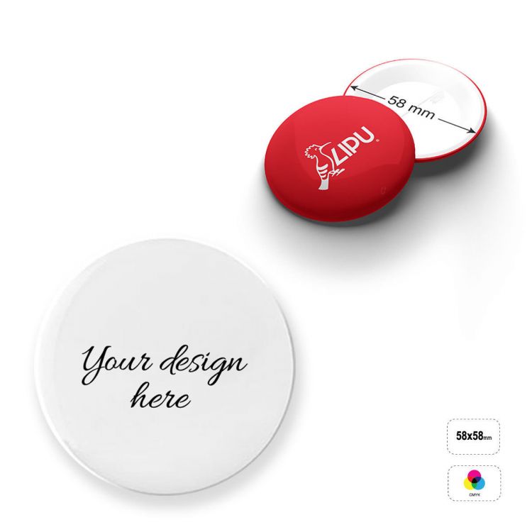 Tin badge, totally customizable. STANDARD product includes plasticized paper insert with full color digital printing and classic Tin badge closure. Several optional finishes available, choose from: fluorescent that glows in the dark, reflective, UV paint, silver, gold, canva effect paper, armadillo skin effect, lizard skin effect, glitter, embossing. Different options for the back of the badge also available, your choice of: bottle opener with magnet, mirror, pinless clasp, snap button, plastic clip, crocodile clip, magnet, magnetic foil, magnetic clasp.