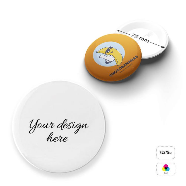 Tin badge, fully customisable. The STANDARD product includes the plastic-coated paper insert with full-colour digital printing and the classic Tin badge fastener. Several optional finishes are available, including: glow-in-the-dark, reflective, UV varnish, silver, gold, canva-effect paper, armadillo skin effect, lizard skin effect, glitter, embossing. Different options for the back of the badge are also available, with a choice of: mirror, pin less safety pin, pinless fastener, snap button, crocodile clip, magnet, magnetic fastener.