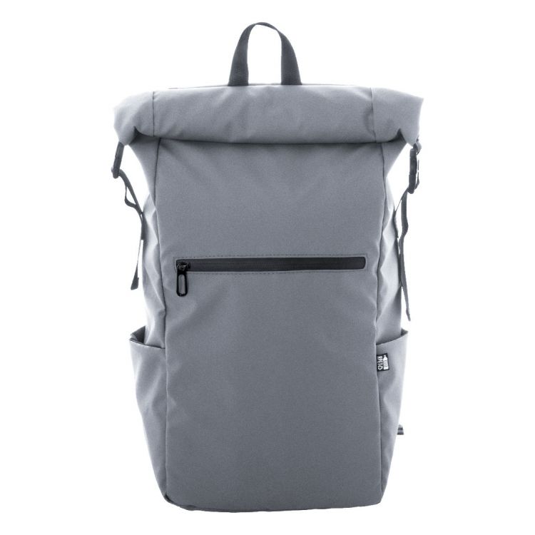 Waterproof, rolltop backpack in RPET with buckle and velcro closure, padded laptop (16") and tablet (10") compartment, zipped front pocket, side pockets, padded back and shoulder straps. PU coated 600D RPET polyester, with distinctive RPET label.