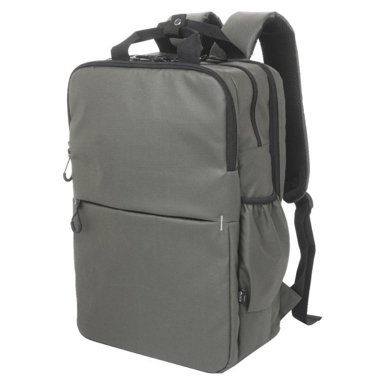 Waterproof RPET backpack with 2 zipped compartments, 2 zipped front pockets, side pockets and padded laptop (16") compartment. With trolley strap, padded back and shoulder straps. PU coated 600D RPET polyester, with distinctive RPET label.