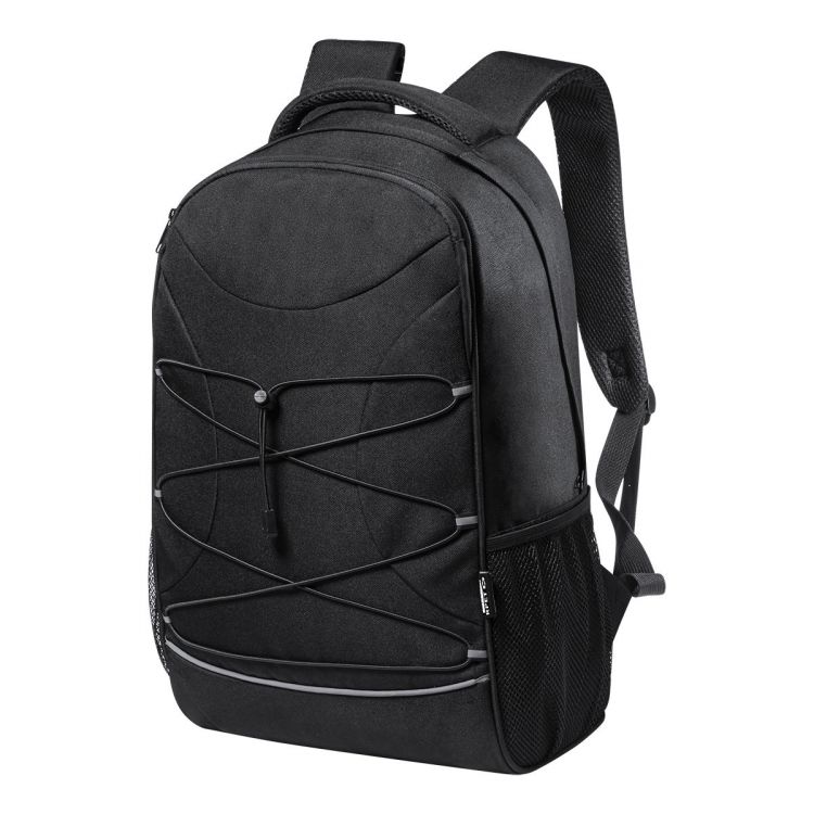 RPET backpack with zipped compartments, mesh side pockets, elastic cords on the front, padded laptop (15") and tablet (12") compartment, padded back and shoulder straps. With distinctive RPET label. 600D RPET polyester, in black color