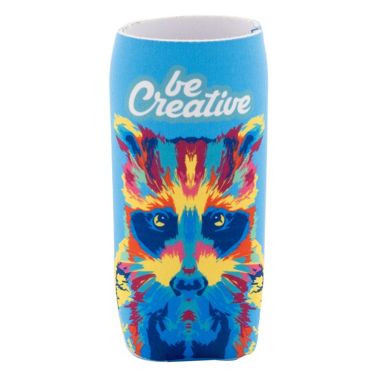 Custom made, RPET neoprene cooler cover for 0,33 L sleek-type aluminium can. With all over sublimation printed graphics. MOQ: 50 pcs