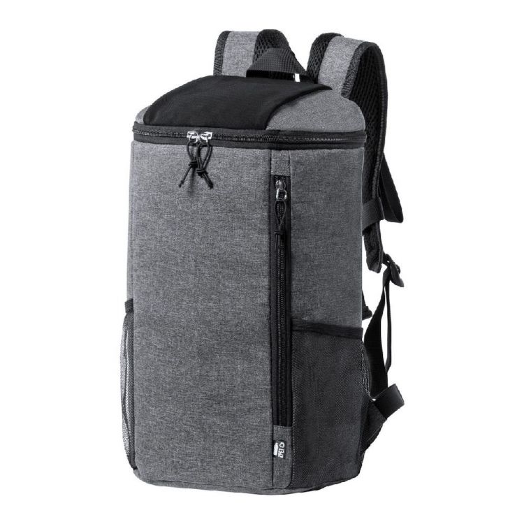 RPET cooler backpack with zipped main pocket with PEVA padding, mesh side pockets and padded shoulder straps. With distinctive RPET label. 600D RPET polyester, in grey color