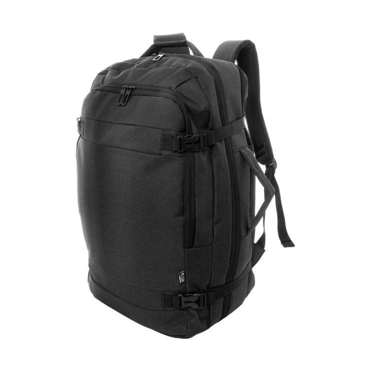 Dual function RPET backpack and document bag with 2 zipped compartments, zipped front pocket and padded laptop (15") compartment. With anti-theft pocket, trolley strap, padded back and shoulder straps. 600D RPET polyester, with distinctive RPET label.