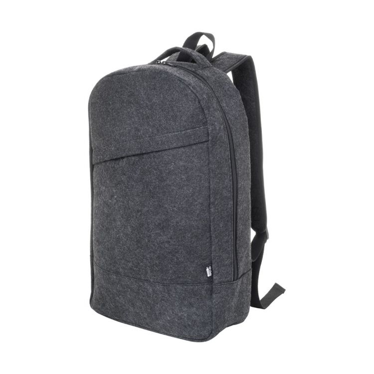 RPET felt backpack with zipped main compartment and front pocket. With laptop (15") compartment, trolley strap and padded shoulder straps. With distinctive RPET label.