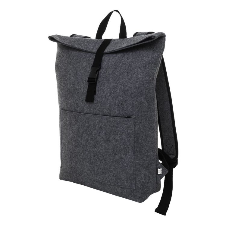 RPET felt rolltop backpack with buckle closure main compartment and zipped front pocket, laptop (15") compartment and padded shoulder straps. With distinctive RPET label.