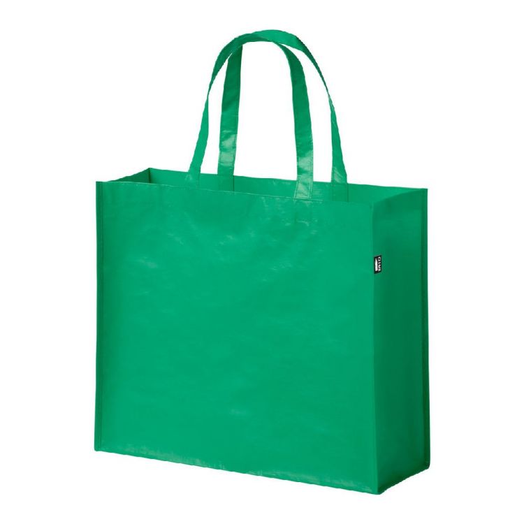 Laminated RPET shopping bag with gusset and medium handles, RPET polyester 105 g/m². With distinctive RPET label.