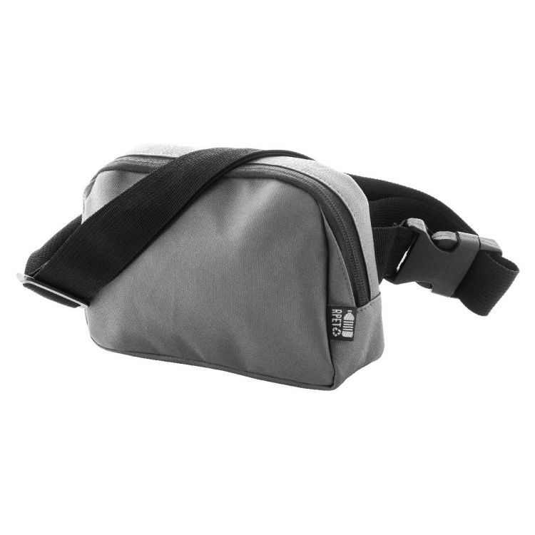 Waterproof RPET waist bag with 2 zipped compartments, mesh inside organizer pockets and adjustable strap. PU coated 600D RPET polyester, with distinctive RPET label.