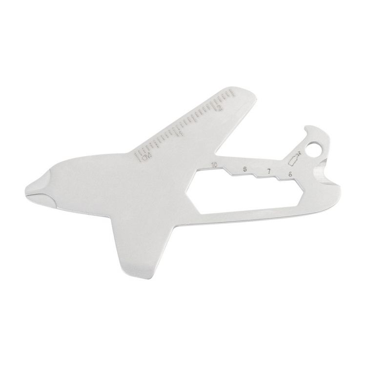 Airplane shaped, recycled stainless steel multi tool keyring with bottle opener, ruler, Philips and flat screwdrivers, hex wrenches and wire cutter