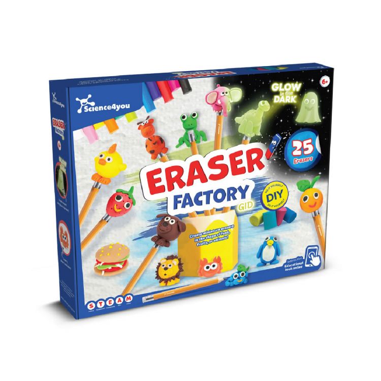 Eraser Factory is the ideal toy for children looking to answer the question: how does an eraser erase what a pencil writes? This kit allows you to create erasers that glow in the dark, giving them a unique and personalised shape. Recommended age: + 6 years. Product in transparent white color