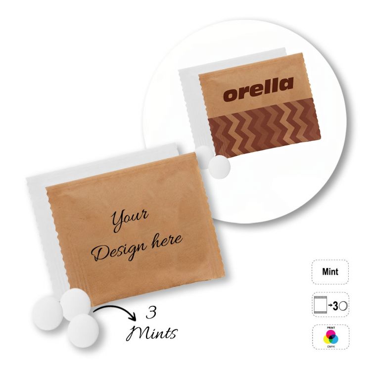 Rectangular sachet containing chewable mints. The letters in the product code correspond to the number of mints inside: A- 1 mint, B- 2 mints, C- 3 mints. Fully customisable food sachet with a choice of: 100% compostable white or transparent sachet or white or kraft paper (choice of finish when ordering). Minimum shelf life - 12 months.