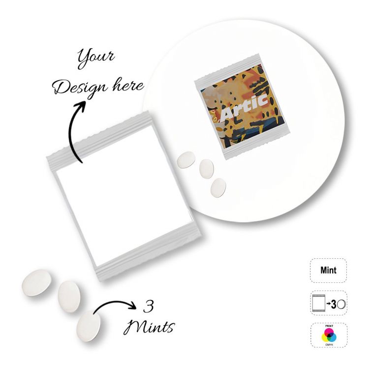 Rectangular sachet containing sugar-free mints. The letters in the product code correspond to the number of mints inside: A- 1 mint, B- 2 mints, C- 3 mints. Fully customisable food sachet with a choice of: 100% compostable white or transparent sachet or white paper (choice of finish when ordering). Minimum shelf life - 12 months.