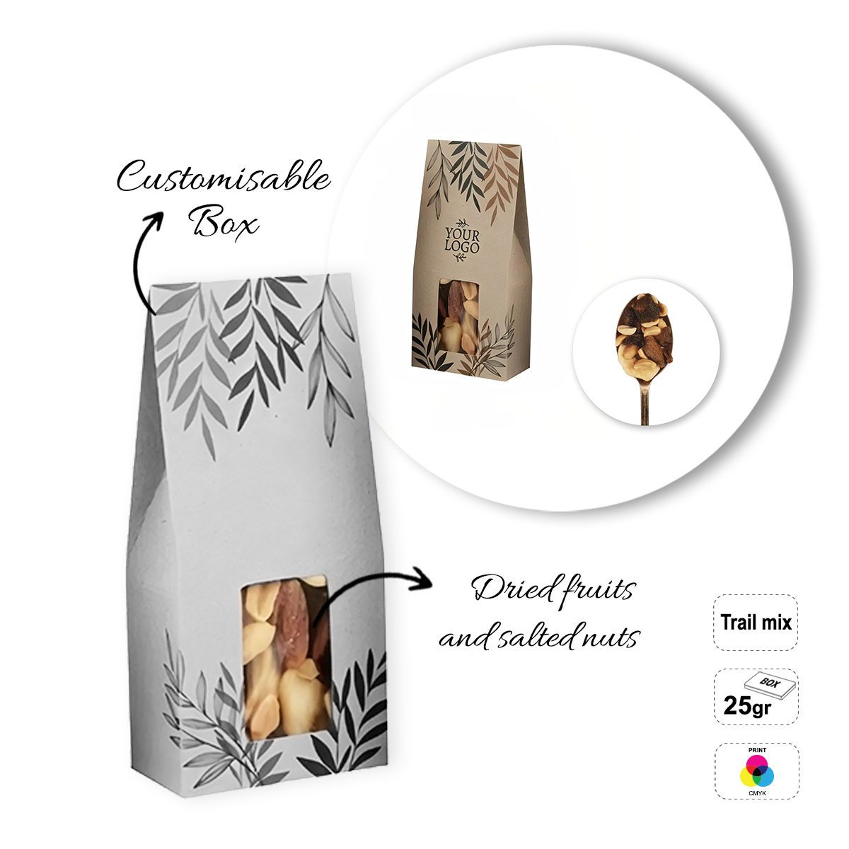 Dried fruit packaging. The letters in the product code correspond to the type of snack: A- toasted and salted pumpkin seeds (7 g), B- mix of dried fruit and salted peanuts (7 g), C- toasted and salted almonds (7 g). Packaging: fully customizable paper box with transparent window on the front, (paper finish: white, kraft or ecru with added grass fibers, chosen when ordering). Minimum shelf life - 6 months.