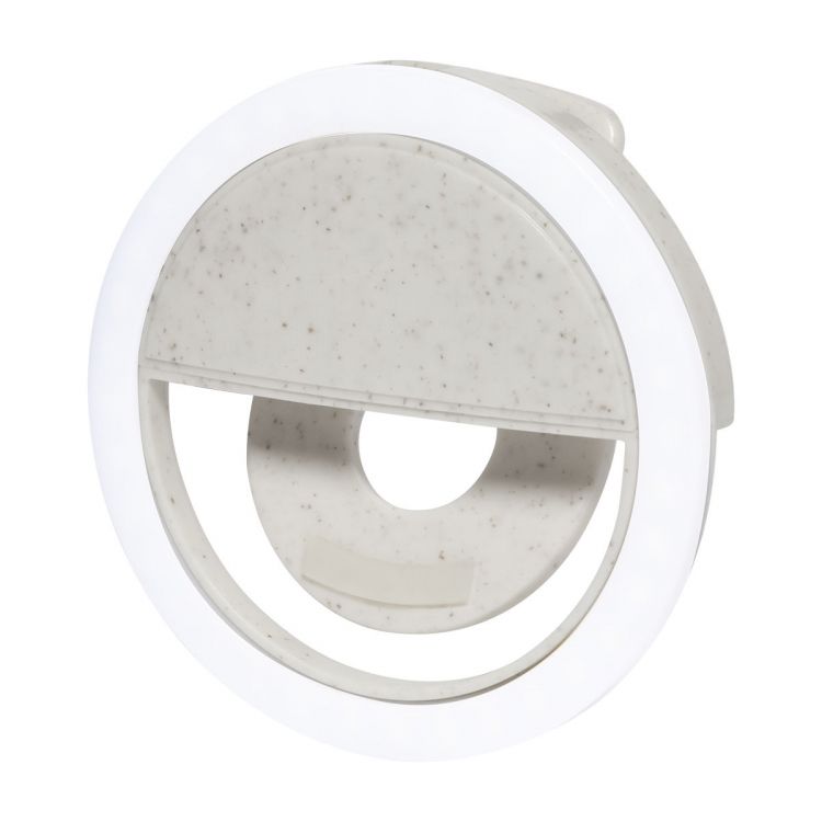 Ecological wheat straw plastic selfie ring light with 36 LED for mobile phones. With 3 adjustable brightness levels and built-in rechargeable battery. Including USB charger cable, in neutral color