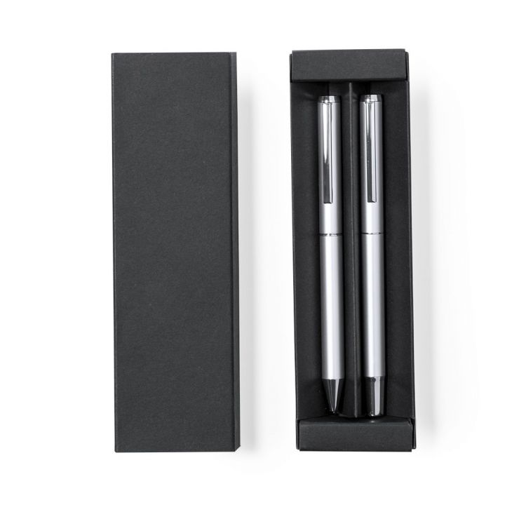 Ball pen and roller pen made in recycled Aluminium. Ball pen with twist mechanism and roller with cap, both equipped with a metal clip. In blue ink and with a glossy finish barrel. Recycled Aluminium logo and presented in an individual kraft box.Recycled Aluminium is a material with almost infinite recycling possibilities, keeping its original properties and consuming less energy during this process.GRS Certification (Global Recycled Standard), which guarantees the recycled origin of the material used to manufacture the product. (neutral color)