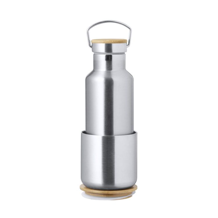 Useful set of thermos flask and thermal tumbler in stainless steel. Including 500 ml capacity stainless steel thermos flask, with safety screw cap, bamboo base and carrying handle. Also comes with a 300 ml capacity stainless steel tumbler with bamboo lid and push-on closure. Presented in a kraft design box. (silver color)