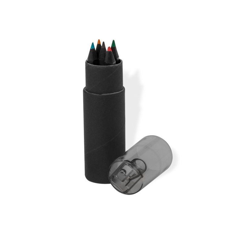 Set of 6 wooden pencils finished in black, with hexagonal body and leads in various colours. Presented in a cylindrical, black recycled cardboard box, with matching transparent hood and integrated pencil sharpener. (black color)