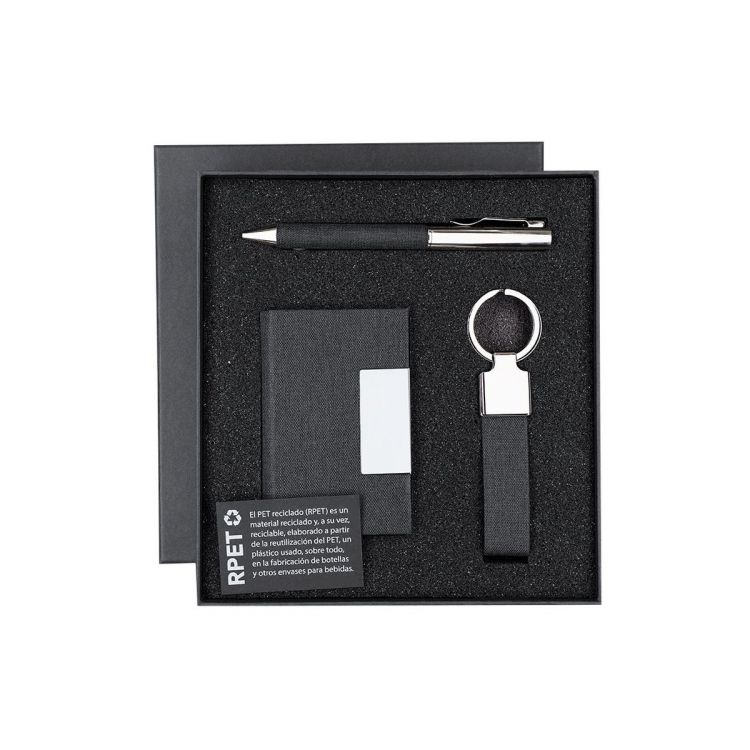 Elegant set in RPET with black bitone finish and metallic details. Includes:-RPET cardholder with black bitone exterior combined and metallic detail, 1 interior compartment and magnetic closure system.-RPET pen with black bitone finish and metallic details. With rotating mechanism and blue ink.-RPET keychain with black bitone finish and chrome accessories.Presented in an individual black case. Includes a black inner card with RPET label.RPET material is made from recycled plastic to promote the reuse of plastic waste and help the sustainability of the planet. (black color)