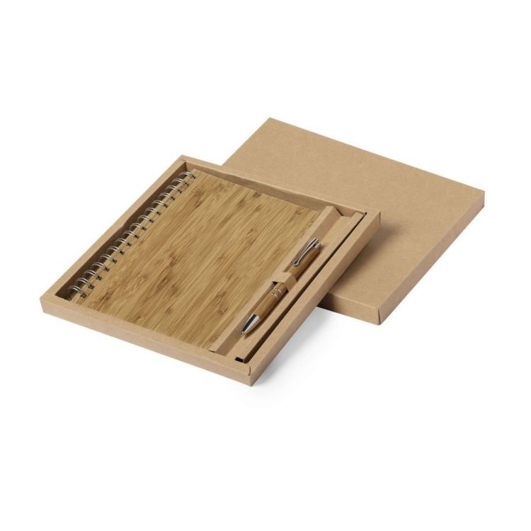 Set of notebook and ball pen in nature line. Ring notebook with hard covers in bamboo, with 80 sheets in striped layout and eco design. Ball pen with push-up mechanism, with bamboo body and metal accessories -jumbo cartridge and black ink-. Presented in a cardboard, die-cut case with eco design. (neutral color)