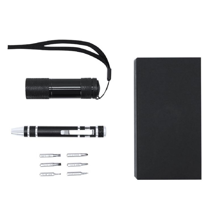 Multifunctional Tool Set with Flashlight and Aluminum Screwdriver. Includes:- Screwdriver with 6 magnetic heads: 3 flat and 3 star, equipped with a practical metal clip for easy attachment and transport.- LED flashlight with 9 LEDs, powered by 3 AAA batteries (not included). Includes a wrist cord for comfort and safety during use.Presented in a black box. (black color)