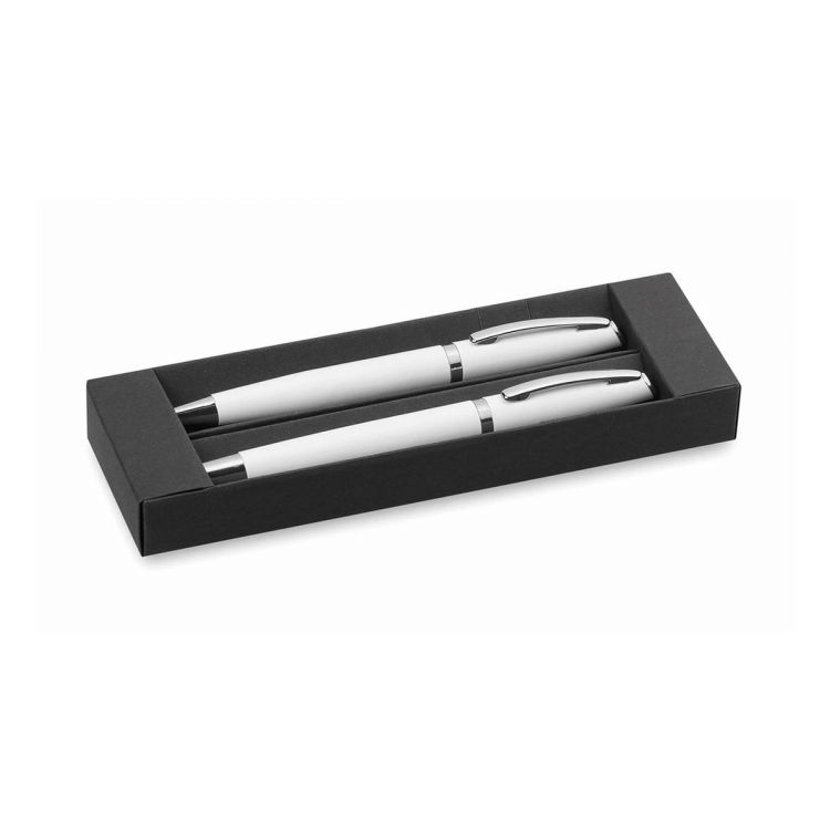 Elegant set of ball pen with twist mechanism and roller with hood in sober design. Aluminum body with silver colored accessories. Presented in an individual cardboard box with black cover. Pen with jumbo cartridge. In blue ink.