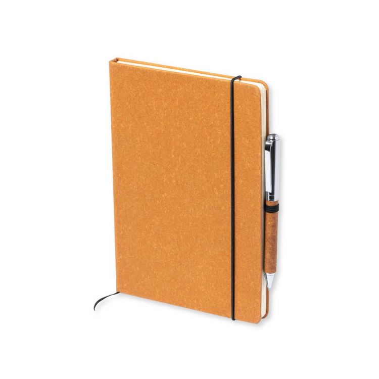 Set of notepad and ball pen in recycled leather. Including:Notepad with hard covers in recycled leather, with 100 inner sheets in striped layout. Including bookmark, elastic binding and ball pen holder in matching color. With the distinctive of recycled leather at the back cover.Ball pen made in chrome plated metal with recycled leather barrel. Stylish metal clip and matching accessories, twist mechanism and blue ink. With the distinctive of recycled leather on the barrel.Set presented in an elegant kraft design case, with independent compartment for notepad and ball pen.Recycled leather recovers the fibers discarded in the manufacturing processes of leather, minimizing the waste of material, contributing to reduce the environmental impact, and preserving at the same time the original features of the leather.